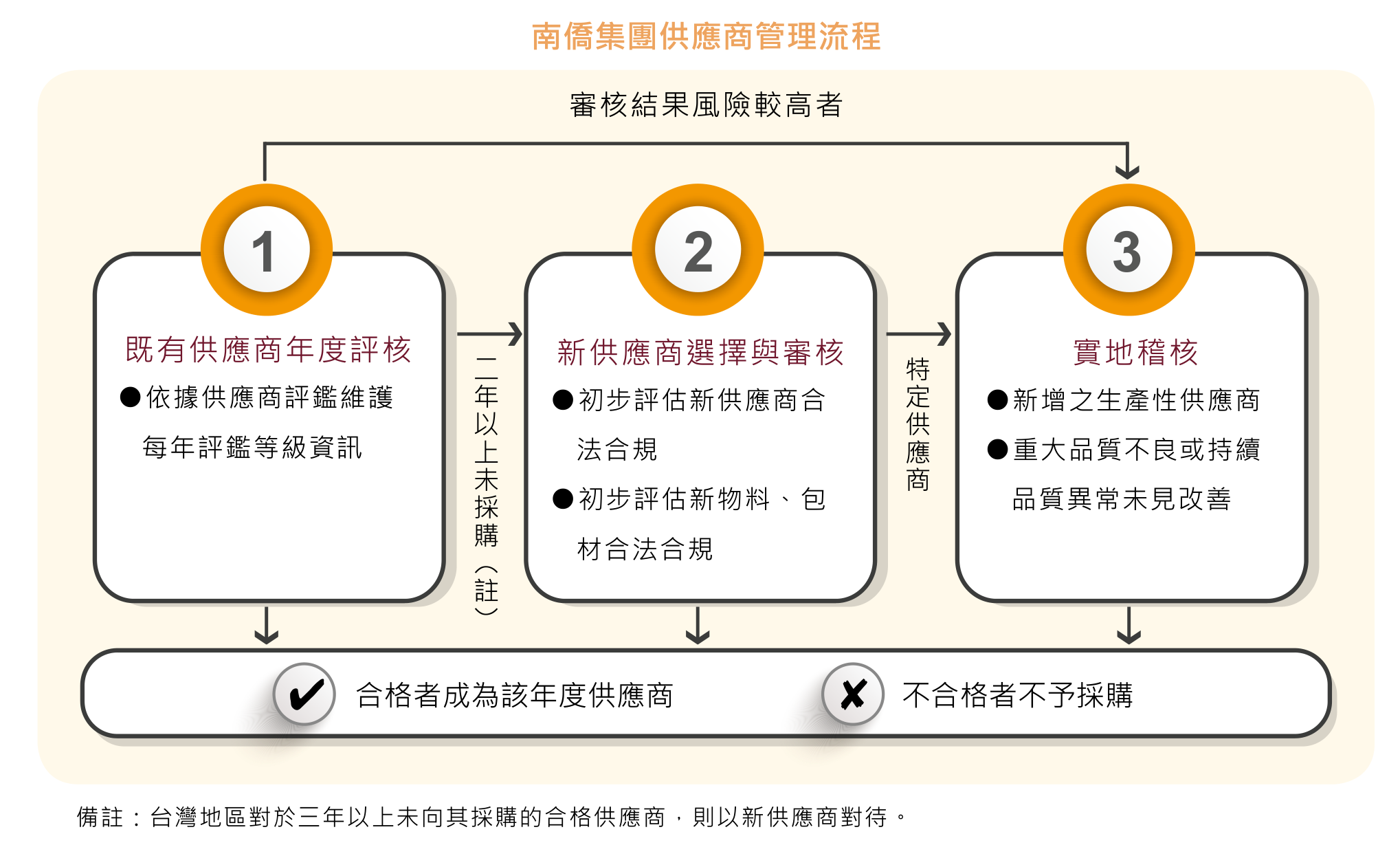 南僑集團透過公平、合理、有效率的供應商管理流程,篩選合格與優良供應商,進而確保每一原料 及包材具穩定之貨源及優良的品質,降低成本,增加產品競爭能力。