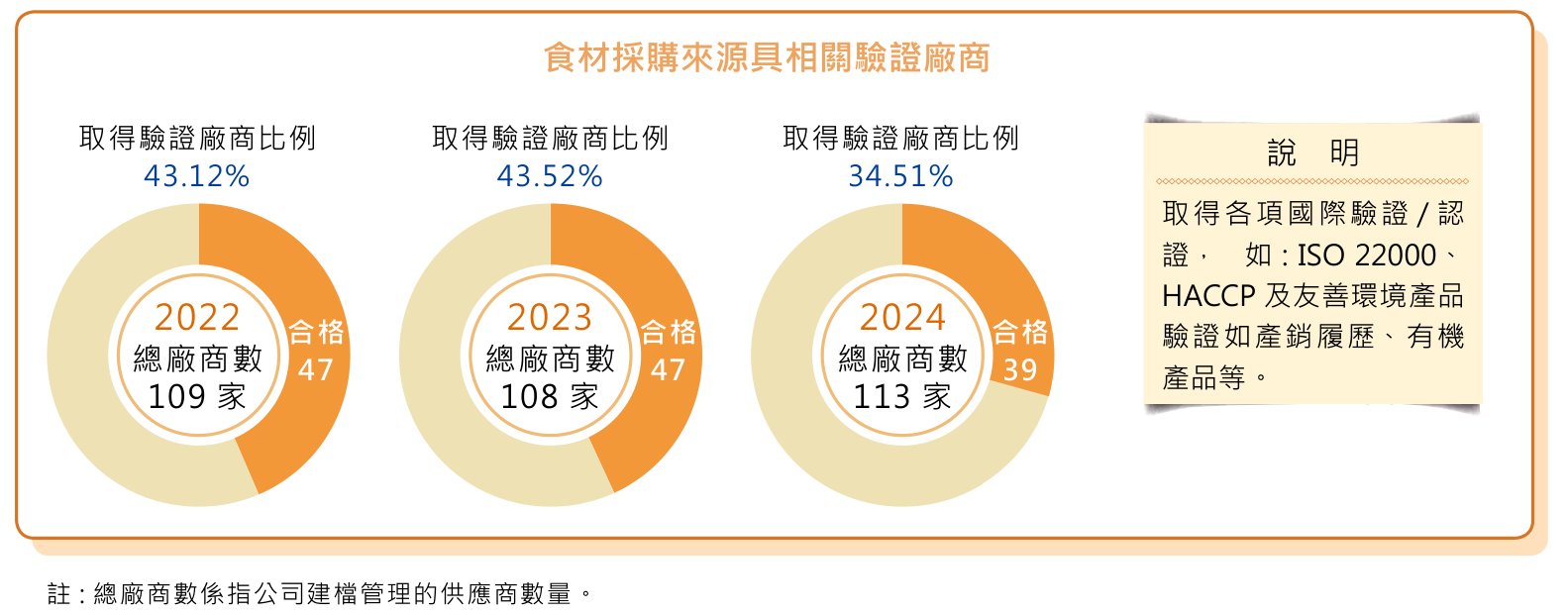 供應商的合作夥伴選擇上,我們亦將具國際驗證如 ISO 22000、HACCP 及友善環境產品驗證如產銷履歷、有機產品列為考量,2024 年食材採購來源具相關驗證廠商為 39 家,占比為 34.51%。在食品安全意識抬頭的今日,我們為確保食材進貨品質安全無慮,將供應商管理、自主檢驗、定期及無預警稽核等工作,落實在日常作業流程中,讓每位上門的顧客都能更安心地享用每一份佳餚。