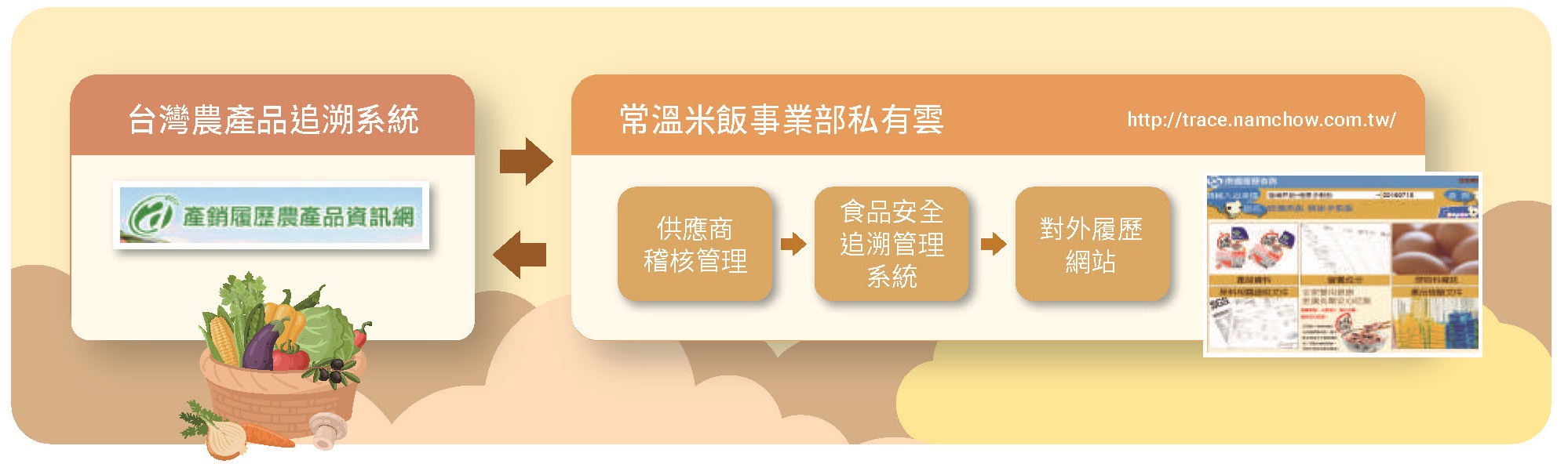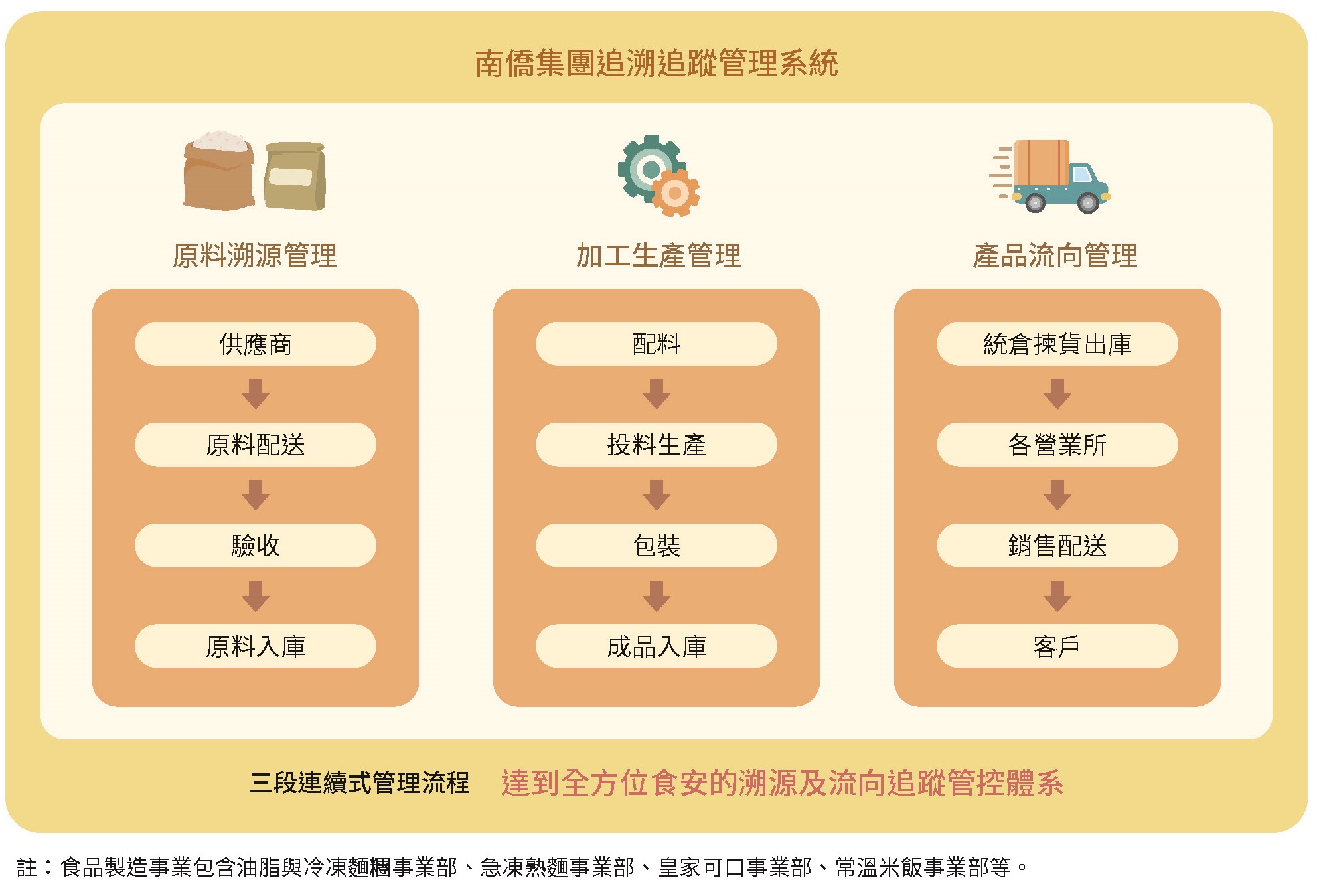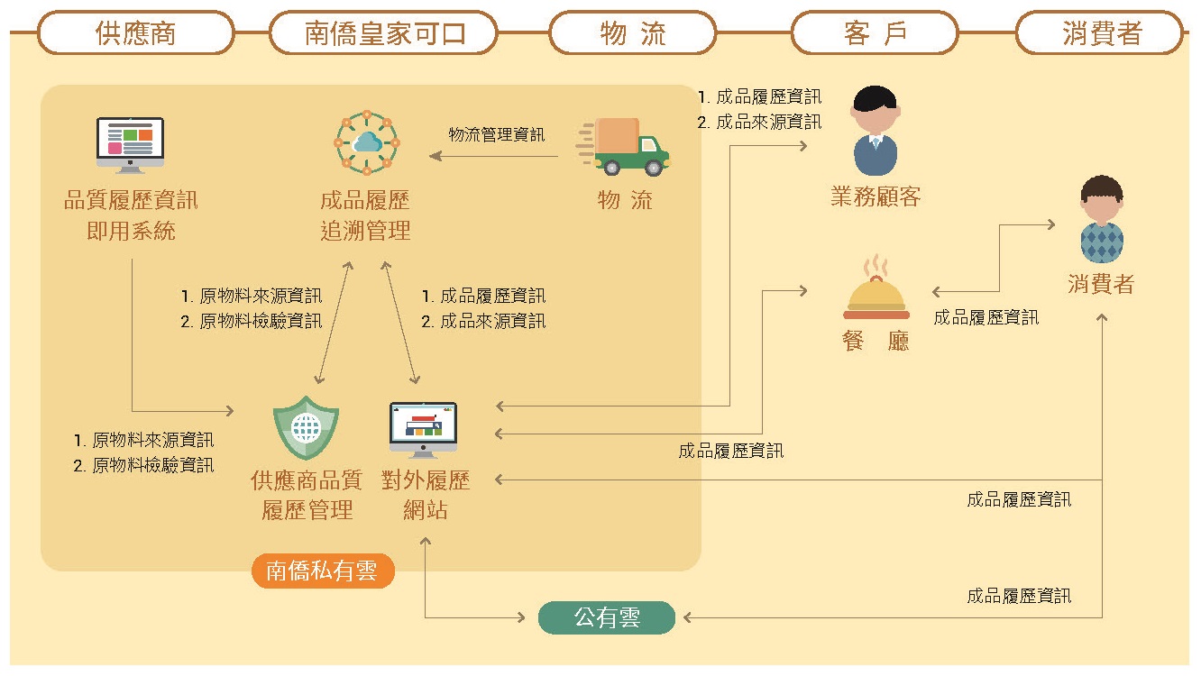 台灣地區食品製造事業皆已依法於食品業者登錄平臺 - 非登不可登錄政府指定之資料,包括食品業者基本資料、營業項目與工廠資料…等。透過原物料採購單號、原物料進廠日期、生產工單號、產品效期、出貨單單號… 等資訊做為產品可追蹤追溯的串接碼,並將採購、製造與銷售資料輸入於ERP 中,使所有產品可 100% 向上追溯至原物料,向下追蹤銷售流向。每年各進行一次產品模擬回收,以驗證產品追蹤追溯制度的有效性。而 ERP 的追蹤追溯資料會整合至南僑集團上傳公有雲平台,便於在平台上查詢。每月 10 日前將前一個月的產品追溯追蹤資料上傳至政府食品雲 ( 食品追溯追蹤管理資訊系統 - 非追不可 3.0 ),並使用電子發票以符合政府食品追溯追蹤電子化管理之目的。