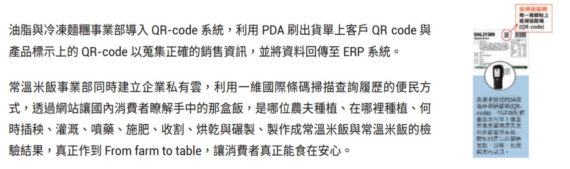 皇家可口事業部導入 Oracle 電子化系統,監控食品追蹤追溯管理系統,從原物料及食品添加物的源頭管理,到產品流向的追蹤,以確實掌握;且搭配杜老爺冰品事業的私有雲系統,讓消費者簡單獲得 100% 產品資訊,給予大眾迅速又確實的產品資料。