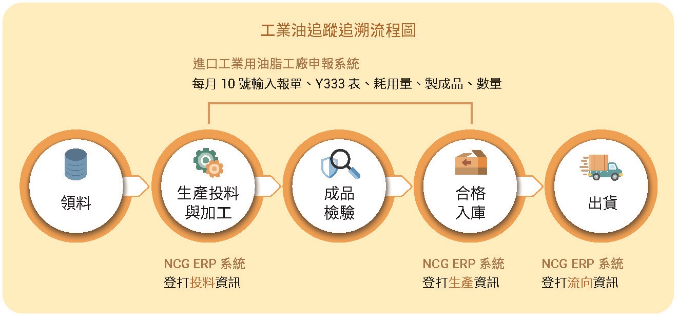 南僑洗劑工業用油依政府法令要求已完成進口一般工業用油脂工廠申報系統之所有進口工業油流向資料建立,桃園廠已完成將 100% 進口工業油製成產品的追溯追蹤資料上傳至進口一般工業用油脂工廠申報系統。