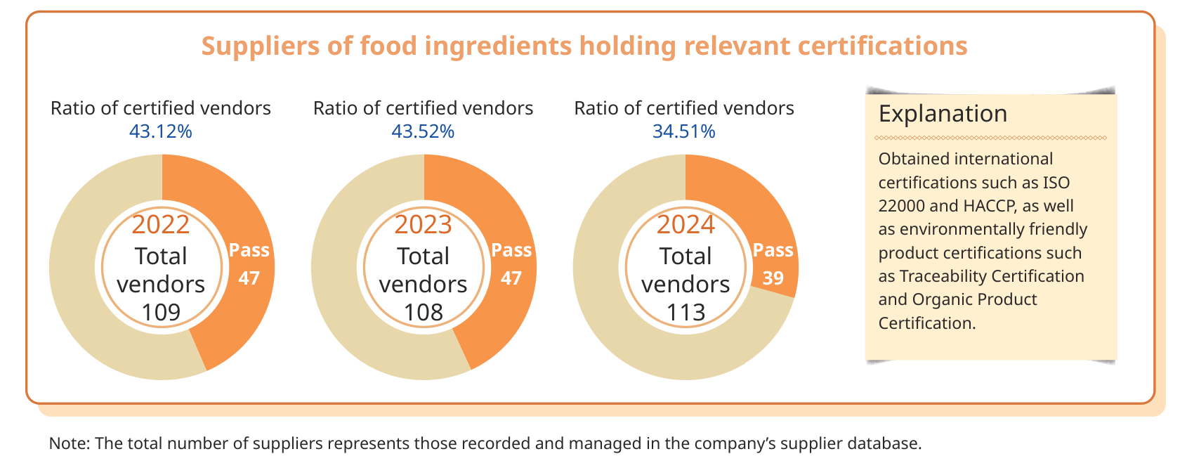 In selecting supplier partners, we prioritize those that hold international certifications such as ISO 22000 and HACCP, as well as environmentally friendly product certifications such as Traceability Certification and Organic Product Certification. In 2024, 39 suppliers from our food ingredient sources were certified under these standards, accounting for 34.51% of all suppliers. With the growing awareness of food safety, we have embedded supplier management, self-inspection, and both scheduled and unannounced audits into our daily operations to ensure the consistent quality and safety of all ingredients. Through these efforts, we aim to provide every customer with peace of mind and confidence in enjoying our cuisine.