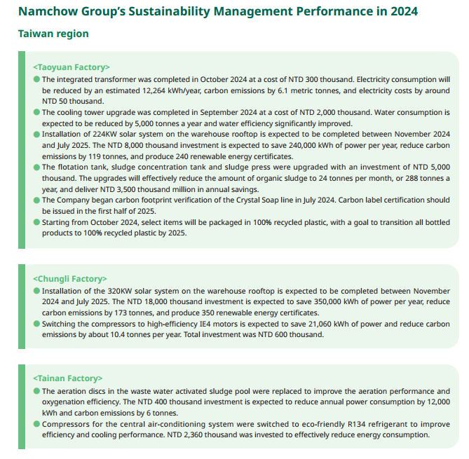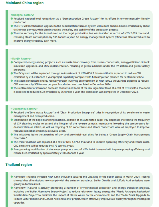 In 2024, Namchow took action to strengthen its commitment to environmental protection by investing NTD 79,521 thousand in various environmental projects involving energy efficiency, waste reduction, and recycling. Through these projects, the Group reduced its carbon emissions by approximately 2,053 tonnes and was recognized as “Demonstration Green Factory,” “Zero-Waste Factory,” and “Clean Production Enterprise.” The accolades demonstrated the Group’s outstanding performance and firm commitment to environmental protection.