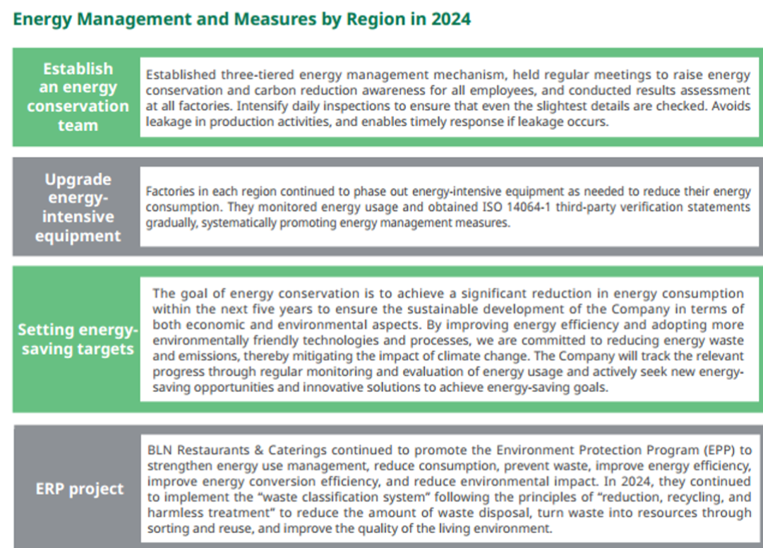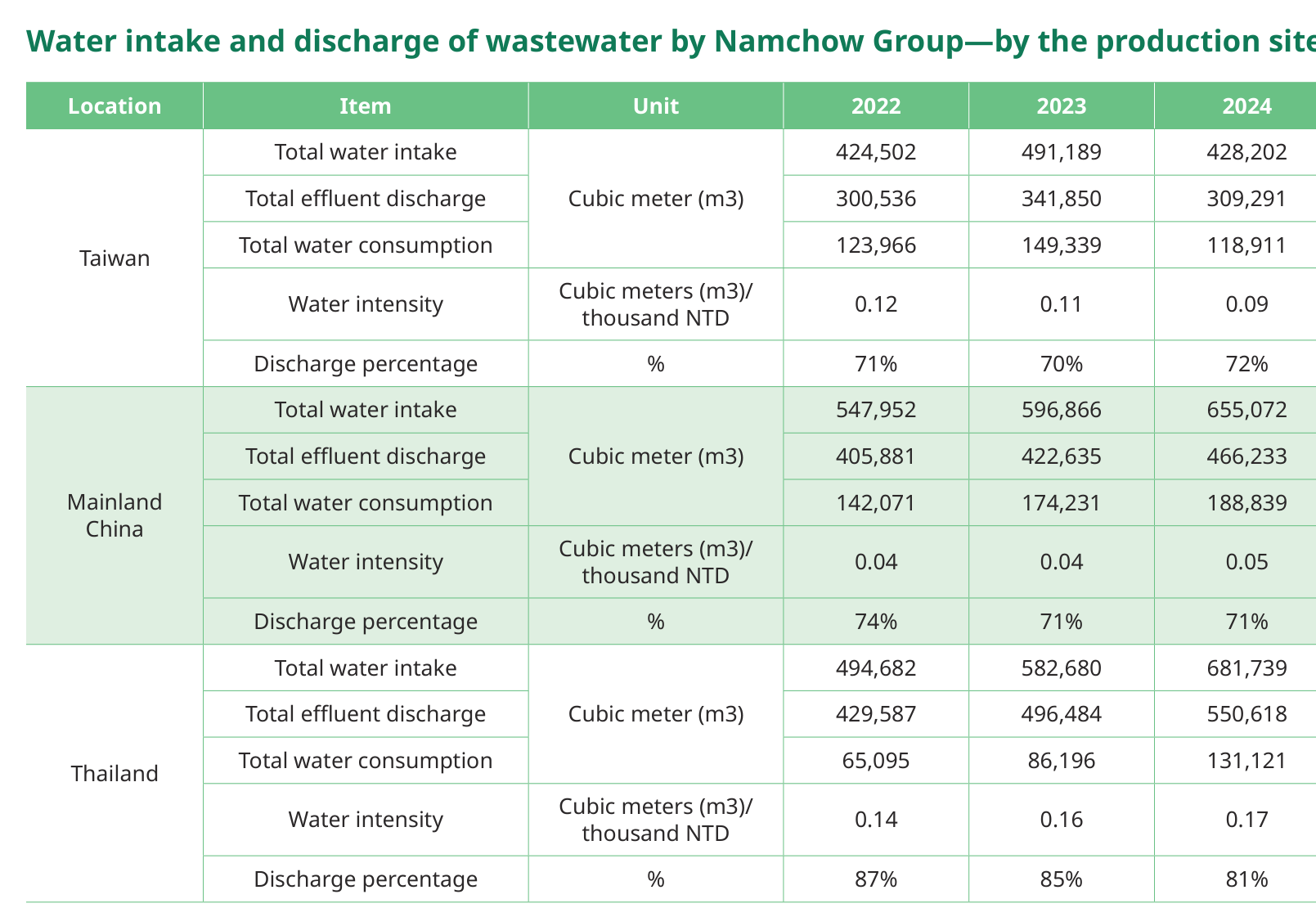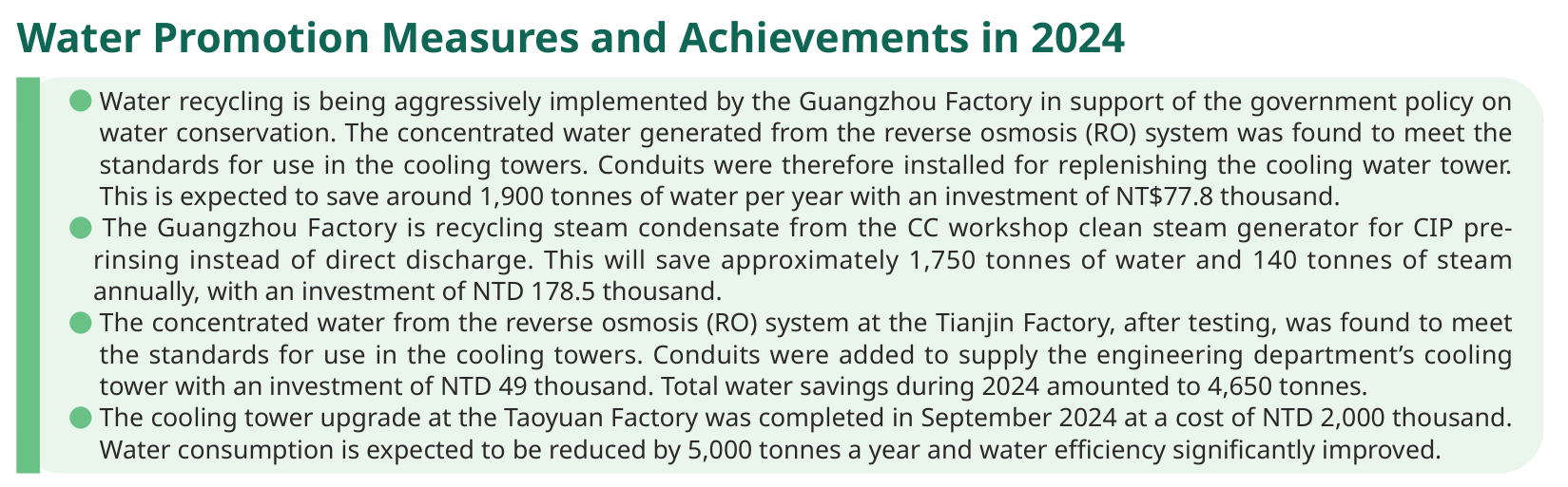 The water used in restaurants and food processing facilities in various regions, including Taiwan and mainland China, is sourced from disposable tap water provided by local governments or relevant authorities. The operational risk associated with water resources is relatively low. However, as part of corporate social responsibility, multiple water conservation measures are implemented to effectively manage water resources. In Thailand, treated water from deep bores is used. The use of groundwater may lead to ground subsidence and deplete underground aquifers, so water conservation and exploration of new sources of water supply are issues our business in Thailand will continue to face in the future.