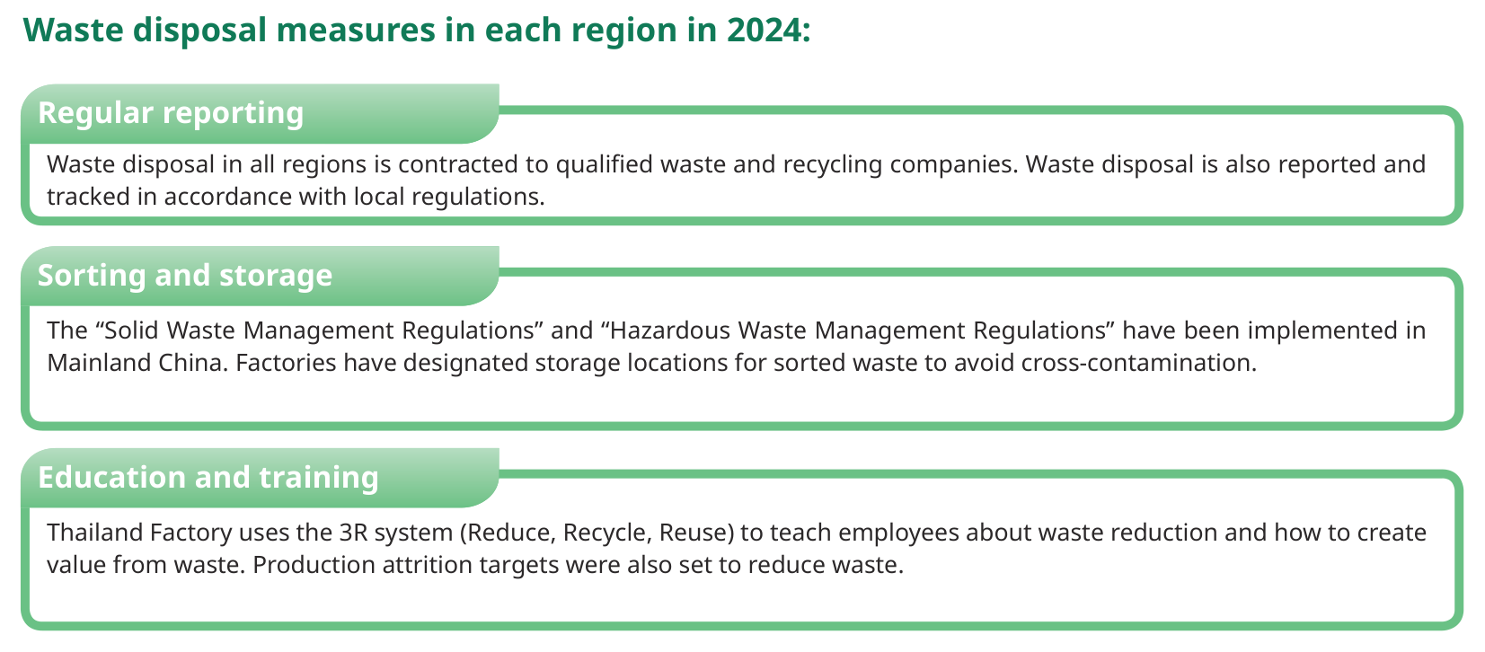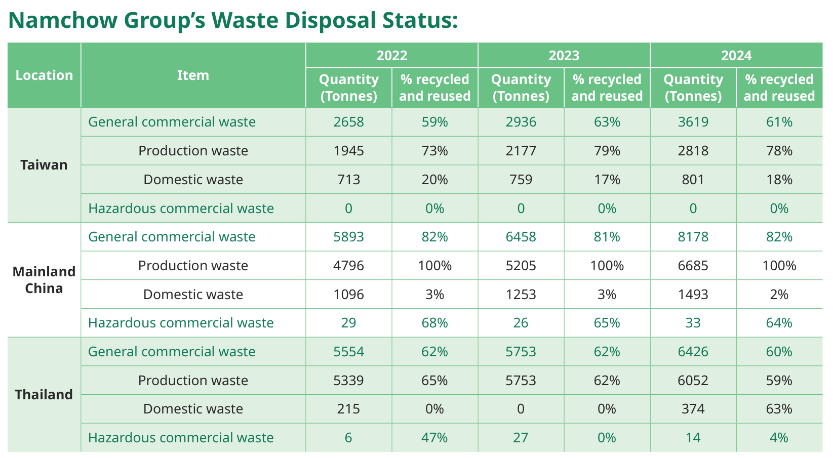 Industrial waste generated by Namchow Group’s operating sites in each region is removed, treated, or recycled in accordance with local government regulations. Related information is also regularly declared through online reporting. In addition, the removal, disposal, and reuse of industrial waste are double-checked online within the prescribed deadline. Waste sorting, collection, storage, management, and disposal are enforced for effective waste control. The waste treatment by the Group’s operating sites in each region in compliance with the requirements of laws and regulations. They apply for discharge or treatment permits in accordance with the law and file reports to the competent authorities truthfully. At present, waste is mainly disposed of by external treatment companies.