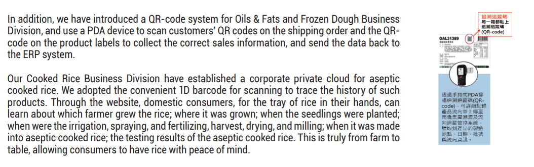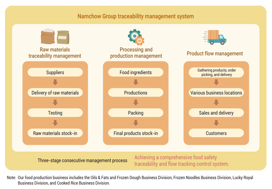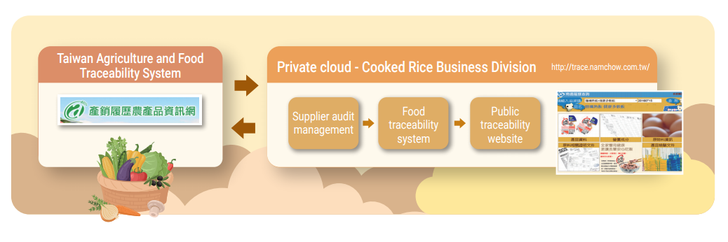 Our food production businesses in Taiwan have registered information designated by the government on the Fadenbook—FDA Registration in accordance with the laws, including basic information on the food business, scope of business, and factory information. Information including the raw material purchase order number, raw material stock-in date, production order number, product expiry date, and shipping order number is used as the concatenated code for product traceability. Purchasing, manufacturing, and sales data are entered into ERP to achieve 100% traceability of products’ raw materials and distribution. We simulate product recall once a year to verify the effectiveness of the product traceability system. The ERP traceability data will be integrated into and uploaded to the public cloud platform of Namchow Group for convenient inquiry on the platform. Before the 10th of each month, we upload the product traceability data of the previous month to the government’s “food cloud” (Food traceability system - Ftracebook), and use e-invoice to help fulfill the purpose of the government’s electronic management of food traceability.