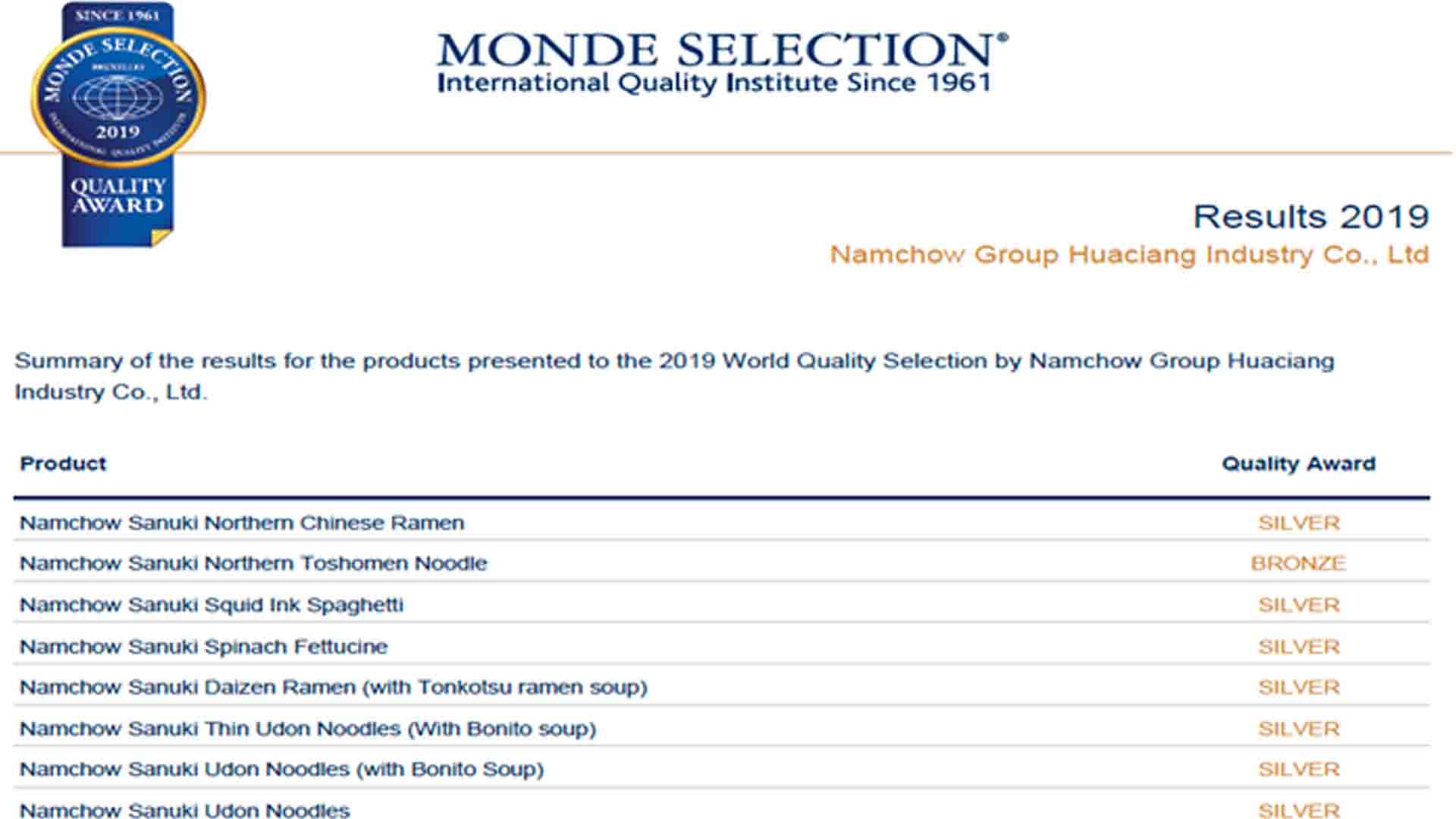 世界品質評鑑大賞(Monde Selection)創建於1961年,是每年國際食品界一大盛事,2019