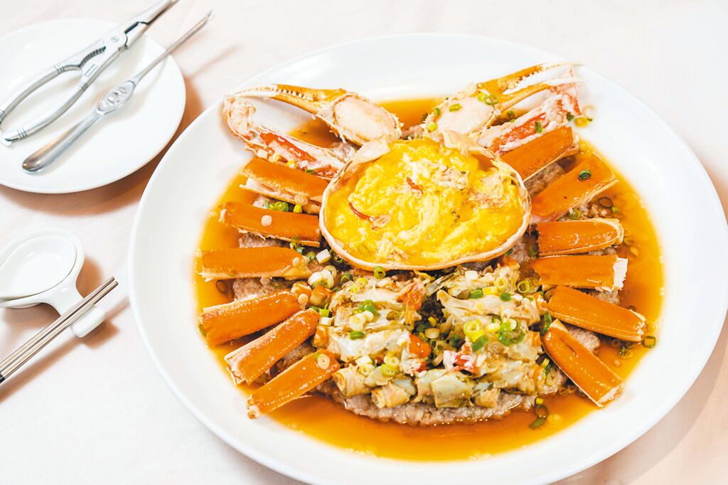 「松葉蟹蒸肉餅」以整隻重達約1公斤的松葉蟹擺在黑毛豬製成的肉餅上,是粵菜「膏蟹蒸肉餅」的超級豪華版。(石智中攝)
