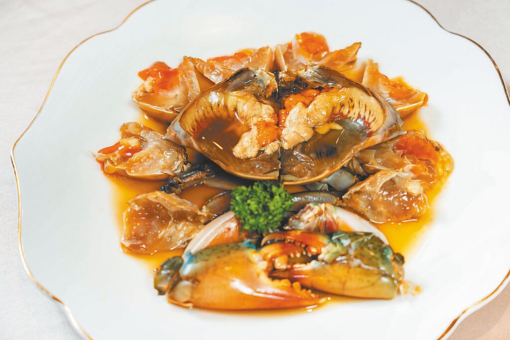 點水樓獨賣的「醉膏蟹」,以3款中國江南黃酒賦予紅蟳多層次的香氣和風味,酒香濃郁,蟹凍Q滑。(石智中攝)