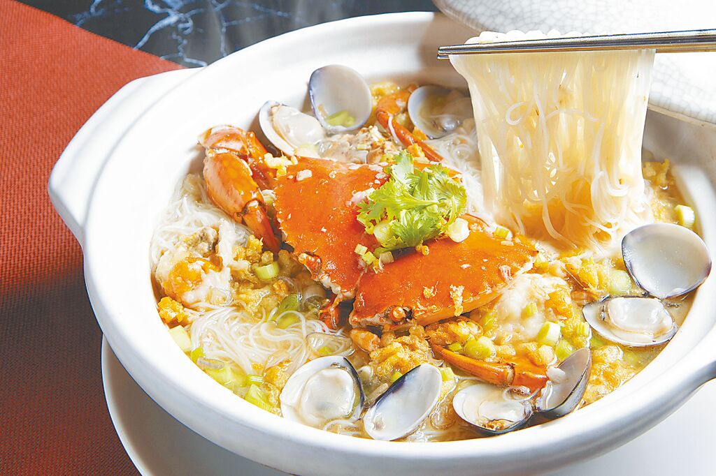 入秋後,天氣漸涼,適合品嘗熱呼呼的鍋物,「紅蟳米粉鍋」以雞湯跟蛤蜊熬煮的湯底,配上新鮮活殺的紅蟳和新竹100%純米粉,起鍋前撒上蛋酥及芹菜末,米粉吸附滿滿湯汁精華,湯汁也濃縮了所有食材的滋味,還可吃到鹹鮮味美的紅蟳,堪稱經典不朽的美味。