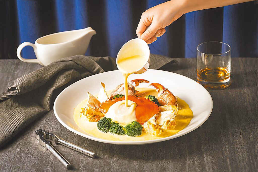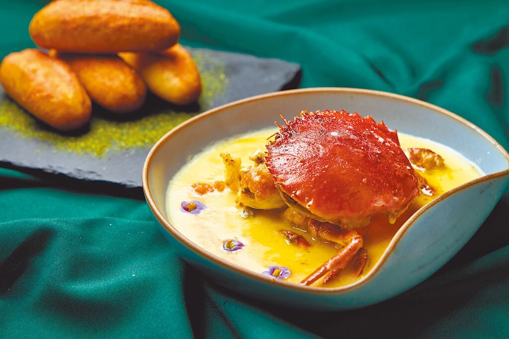 中西結合的「甜奶酒起司紅蟳」,主廚揉合歐陸料理元素調製甜奶酒起司醬,為秋蟹增添創意。(玖尹提供)